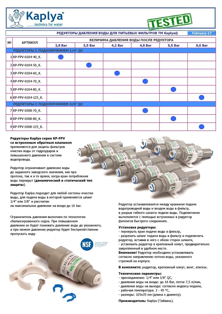 Kaplya KP-FPV-0104-70_K - редуктор давления с адаптером к трубке 1/4". Сертифицирован NSF. Предохраняет системы очистки воды - от перепадов давления в водопроводной сети, которые могут повредить капиллярную мембрану, колбы и т.д.