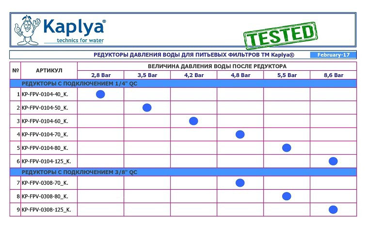 Kaplya KP-FPV-0104-125_K - редуктор давления с адаптером к трубке 1/4". Сертифицирован NSF. Предохраняет системы очистки воды - от перепадов давления в водопроводной сети, которые могут повредить капиллярную мембрану, колбы и т.д.