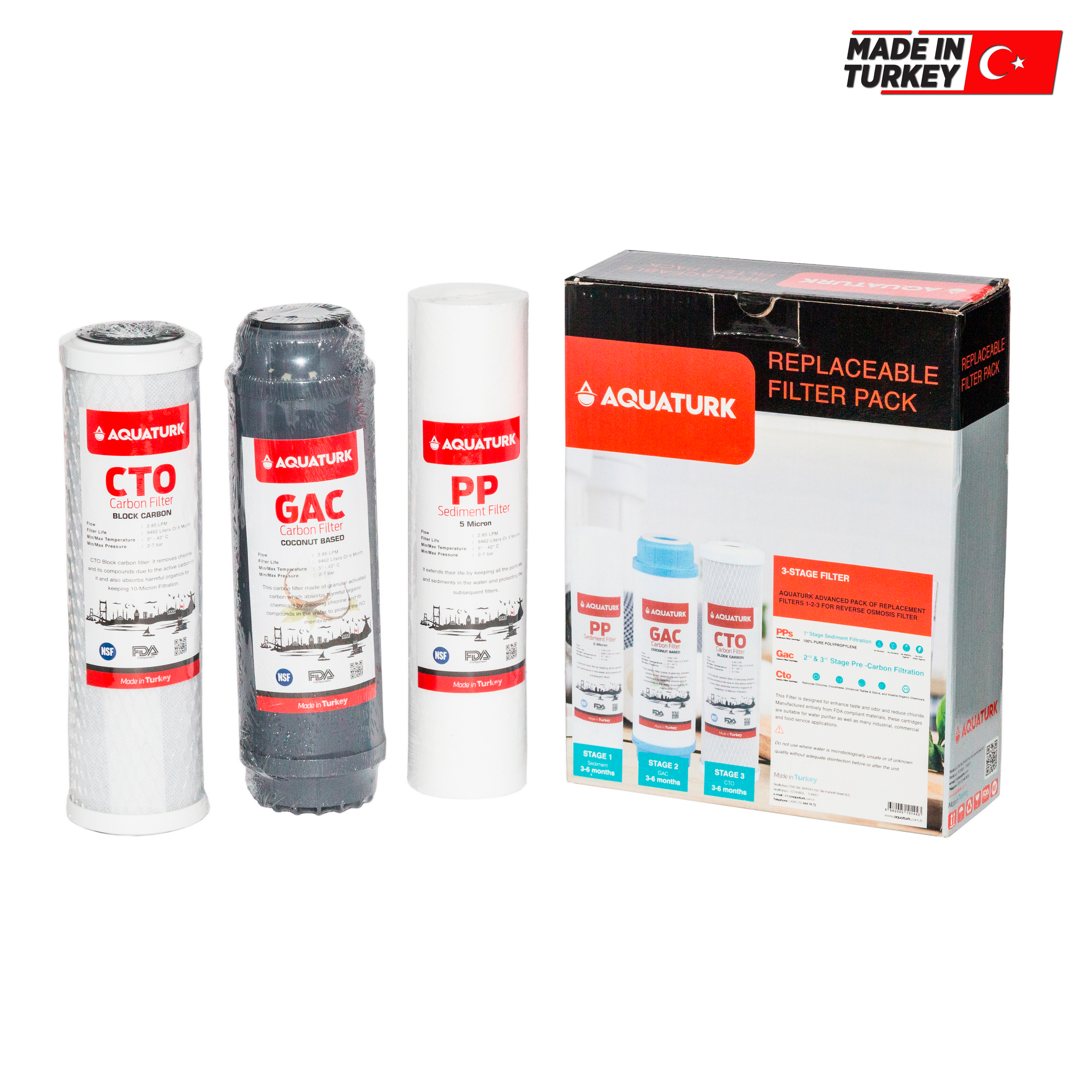 Комплект картриджей AQUATURK 3crt Набор картриджей оптимален для систем обратного осмоса AQUATURK и других производителей с размером картриджей 10".