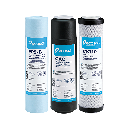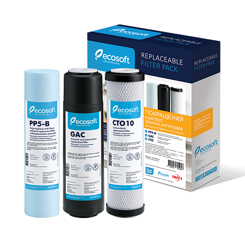 - Ecosoft PP5 - механический полипропиленовый картридж с бактериостатическими свойствами, со степенью фильтрации 5мкм. Специальная бактериостатическая добавка пищевого класса в два раза уменьшает образование слизи на картридже.