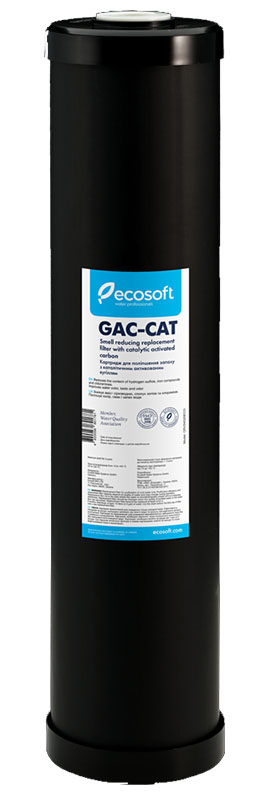 Ecosoft GAC-CAT Centaur – картридж 20" Big Blue с загрузкой из битумного каталитического угля компании Calgon Carbon. Уголь Centaur разрабатывался для удаления из воды сероводорода, железа Fe2 и Fe3, нефтепродуктов улучшения вкуса и цветности.