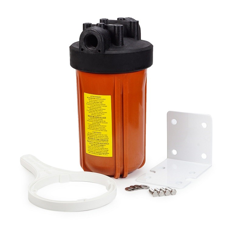 Колба Big Blue 10" Kaplya FH10B1-HOT состоит из элементов: крышки с воздушным клапаном, стакана, одного уплотнительного кольца, крепежного кронштейна, ключа и шурупов