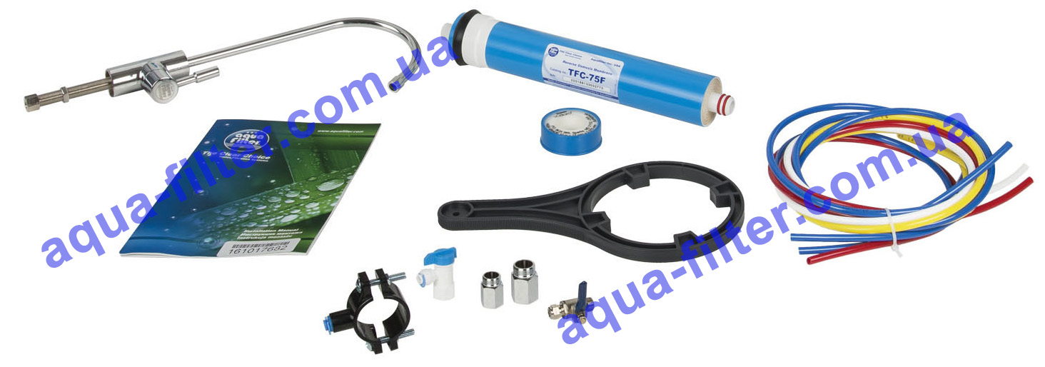 Фильтр Aquafilter RX-RO5-75 /RX55145516/ полностью укомплектован всеми переходниками для подсоединения к трубе 1/2" и краном на мойку