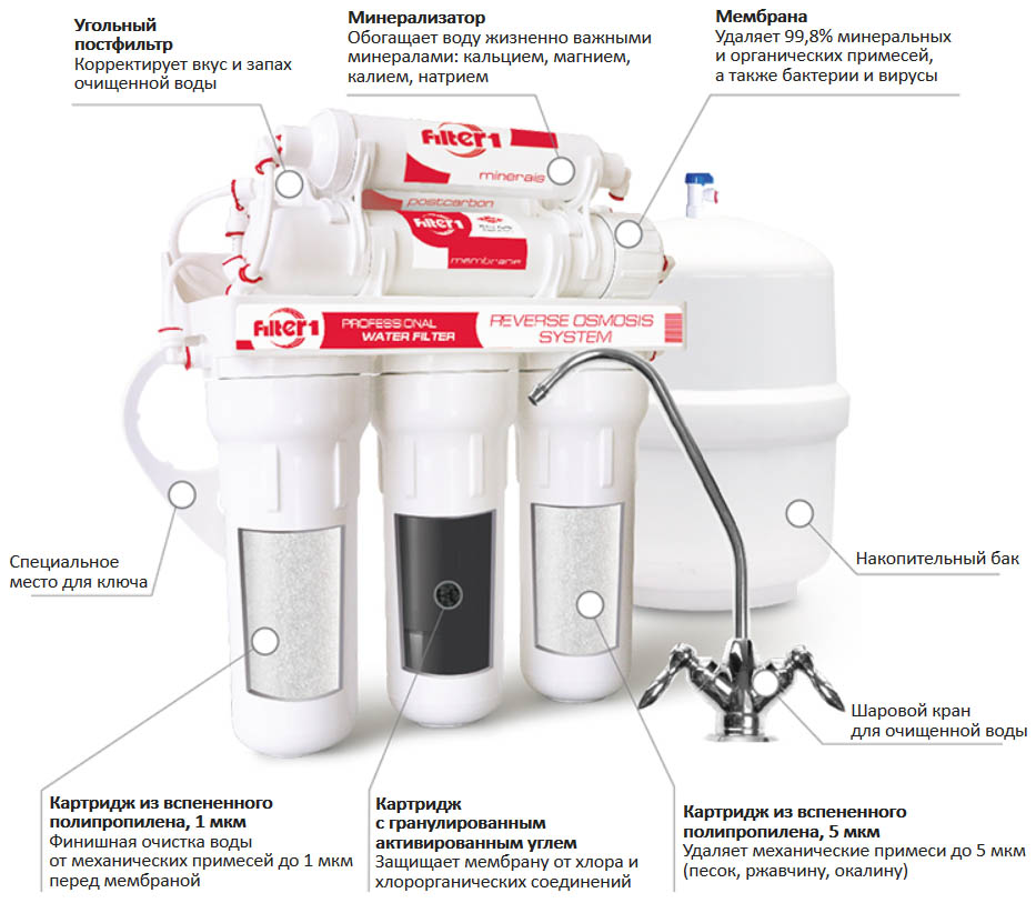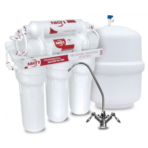 Пятиступенчатый фильтр обратного осмоса Filter1 RO6-50M - фильтр очистки воды с минерализатором под кухонную мойку. Бытовая система обратного осмоса Filter1 RO6-50M предназначена для установки под мойкой со степенью фильтрации 0,0001 мкм, что позволяет удалять из воды большинство загрязнений, в том числе вирусы и бактерии.