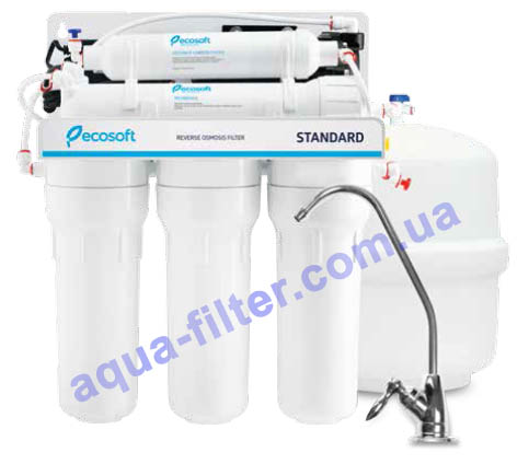 Пятиступенчатый фильтр обратного осмоса Ecosoft Standard 5-50P - фильтр очистки воды под кухонную мойку работающий при пониженном давлении, до 3х атм. Бытовая система обратного осмоса Ecosoft Standard 5-50P предназначена для установки под мойкой со степенью фильтрации 0,0001 мкм, что позволяет удалять из воды большинство загрязнений, в том числе вирусы и бактерии.