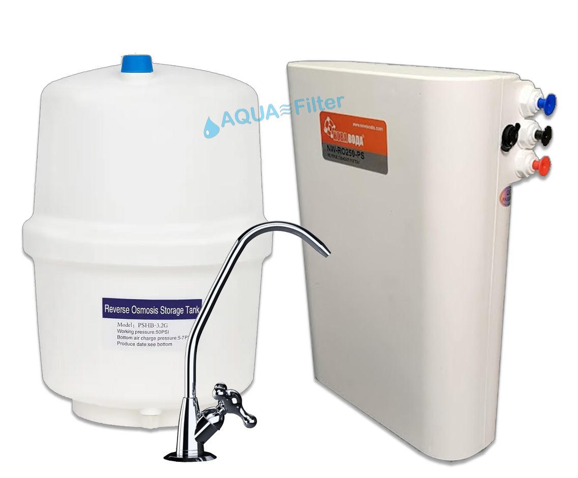 Все питьевые системы обратного осмоса NovaVoda NW-RO250-PS с помпой поставляются в сборе и комплектуются: