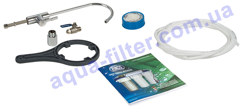 Фильтр Aquafilter FP3-HJ-K1 полностью укомплектован переходниками для подсоединения к трубе 1/2" и краном на мойку